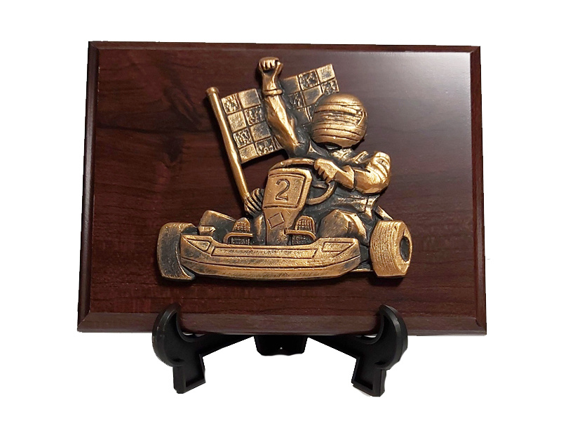 Mooie houten standaard met metalen kartfiguur incl. graveerwerkafmeting houten bordje: 20 x 15cmGrote aantallen zijn nog leverbaar op aanvraag