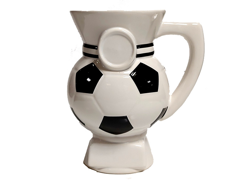 Mooie aardewerk voetbalmok van 15cm hoog, nog een paar stuks..Leuke mok met ruimte voor een sportafbeelding en graveerplaatje.