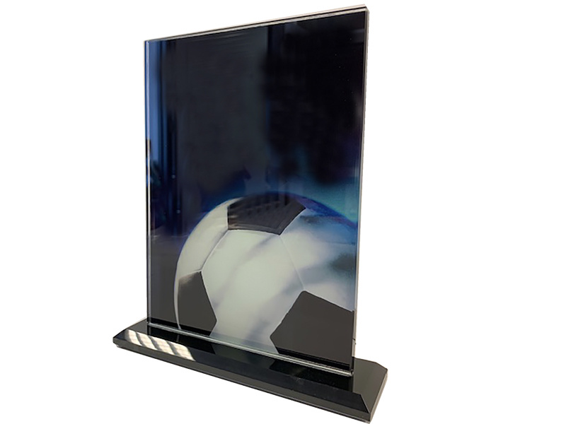 Mooie glazen standaard voetbal, hoogte 21cm, incl. graveerwerk